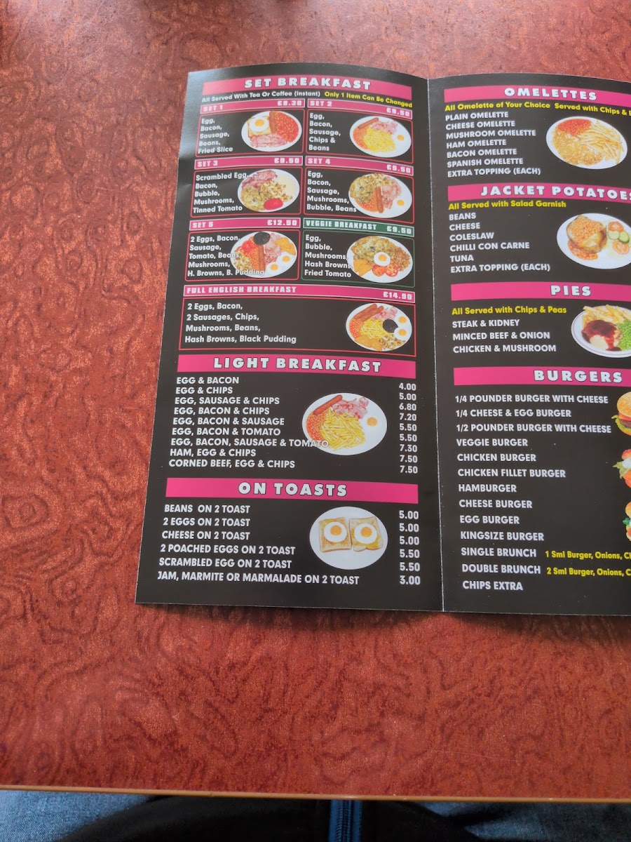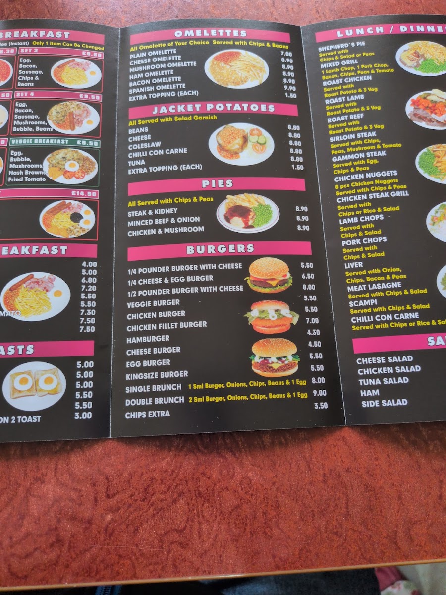The menu features classic café staples such as full English breakfasts, a selection of omelettes, and satisfying burgers alongside lighter options like poached eggs on toast. You can enjoy a warm cappuccino or other comforting drinks, perfect for a slow morning or an afternoon break.